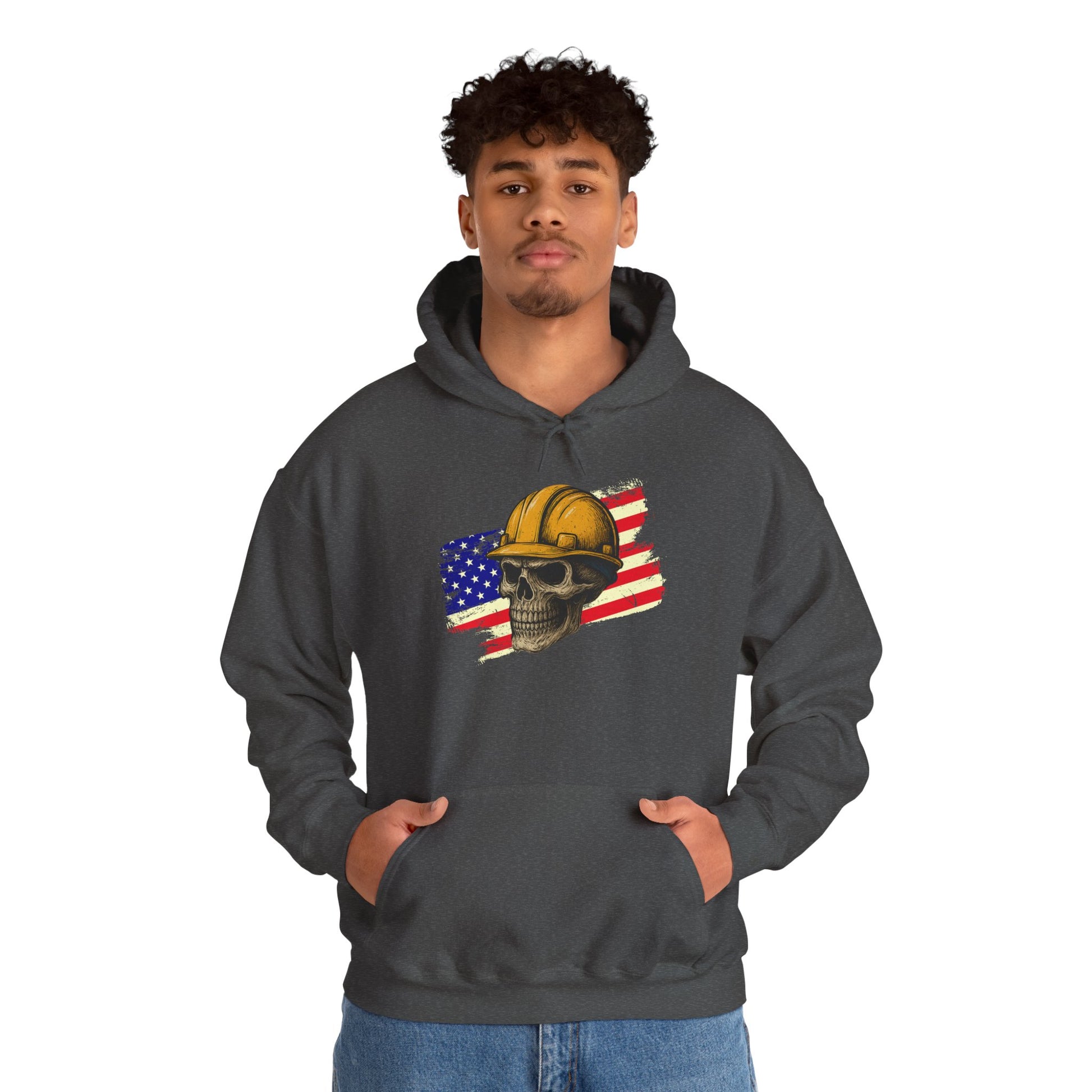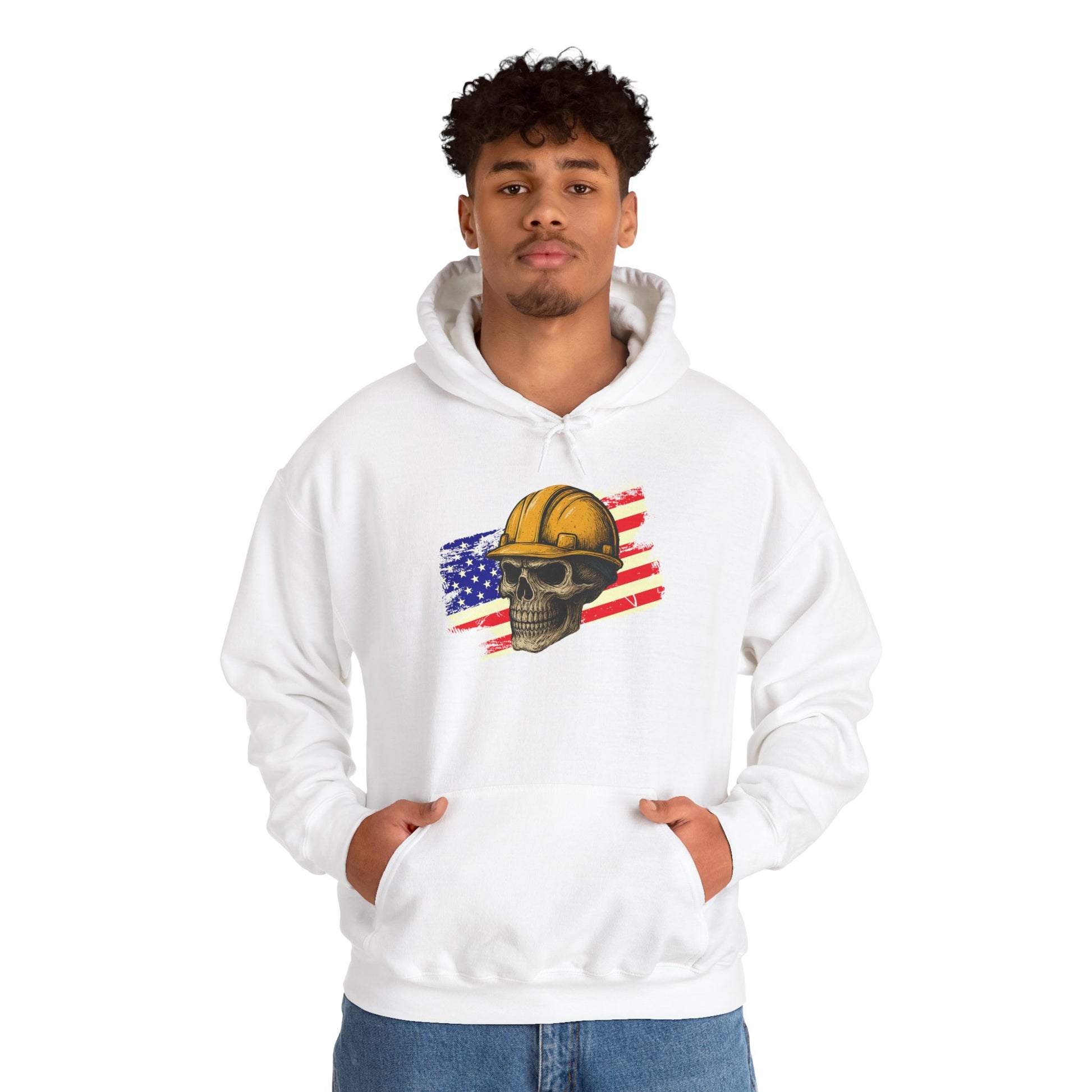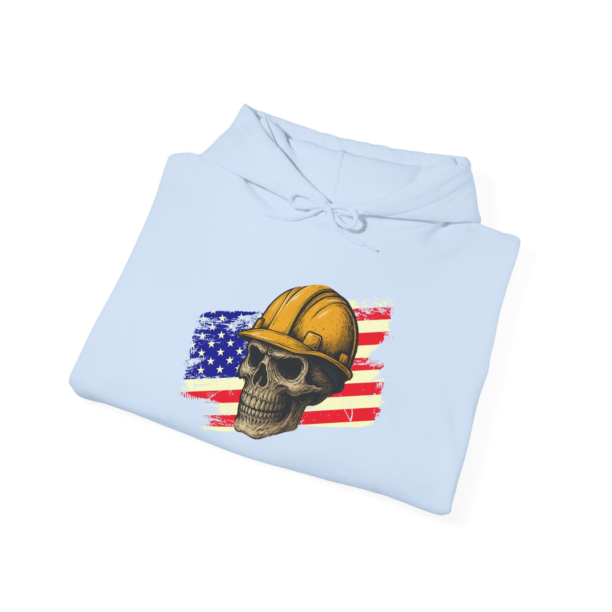 American Construction Skull Hoodie — Worker Hard Hat Flag Design