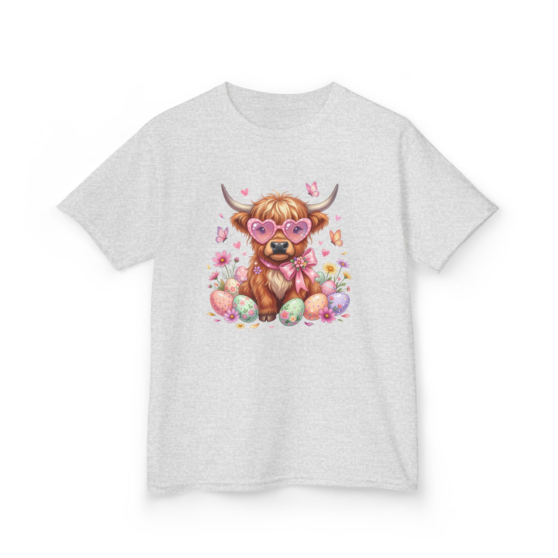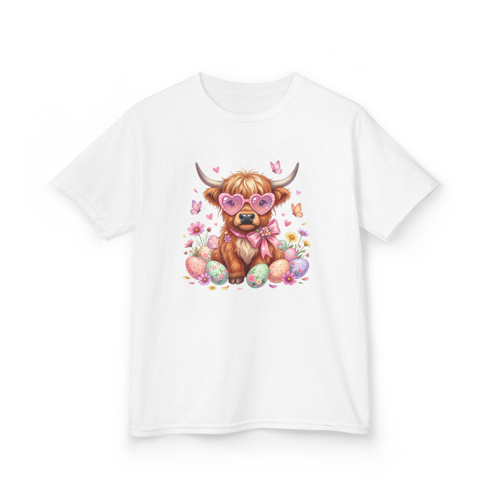 Kids Tee — Cute Highland Cow with Heart Glasses & Easter Eggs